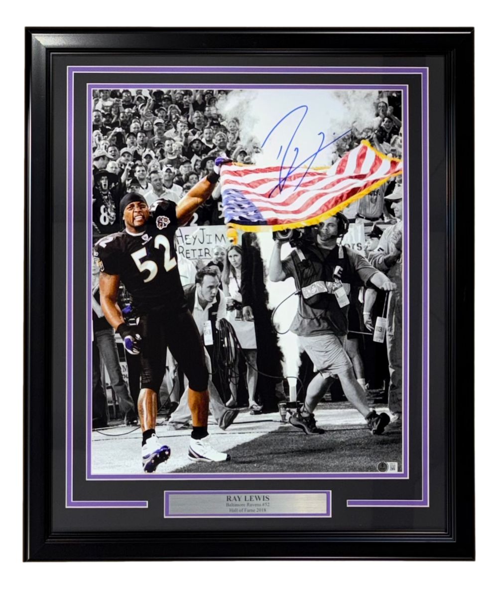 Featured is a Ray Lewis signed 16x20 Baltimore Ravens photo. This photo has been hand signed by Lewis and comes with the Beckett witnessed hologram and certificate of authenticity. This photo has been professionally framed and matted and is approximately 22x27. This photo would make a great addition to any sports memorabilia collection!.