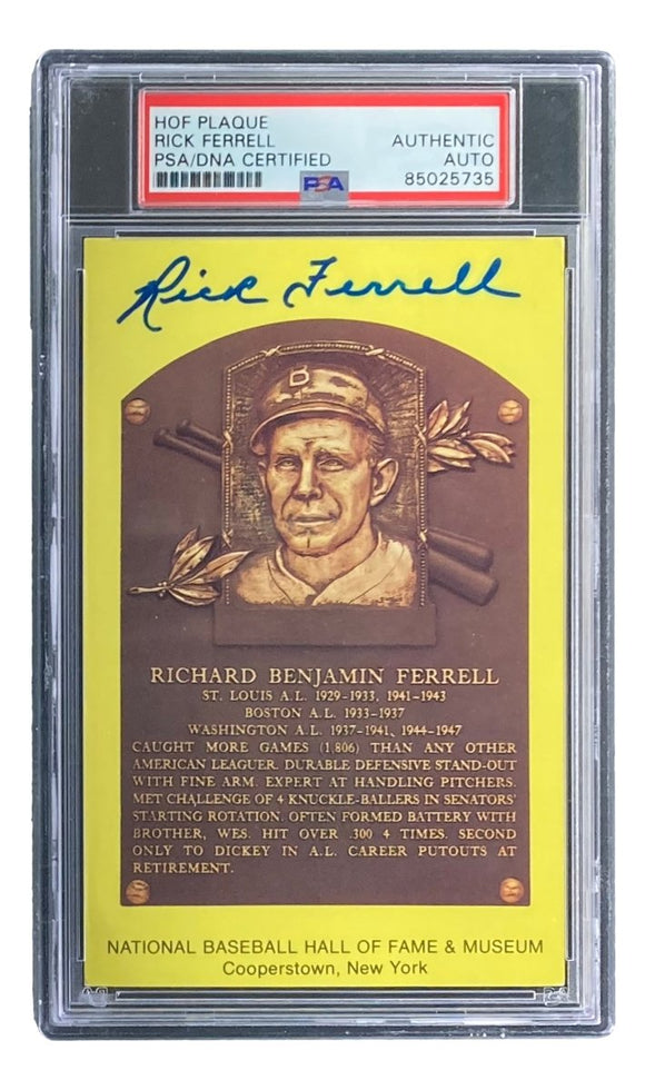 Featured is a Rick Ferrell (Boston Red Sox) signed 4x6 Hall Of Fame plaque card. This card has been hand signed by Ferrell and has been authenticated and encapsulated by PSA/DNA. This card would make a great addition to any sports memorabilia collection!.