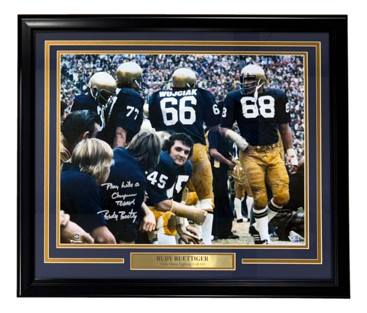 Featured is a Rudy Ruettiger signed 16x20 Notre Dame photo, inscribed "Play Like A Champion Today!". This photo has been hand signed by Ruettiger and comes with the Fanatics hologram and certificate of authenticity. This photo has been professionally framed and matted and is approximately 22x27. This photo would make a great addition to any sports memorabilia collection!.