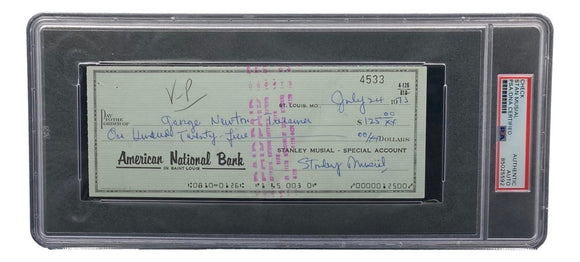 Featured is a Stan Musial St. Louis Cardinals signed bank check. This check has been hand signed by Musial and has been authenticated and encapsulated by PSA. This check would make a great addition to any sports memorabilia collection!.