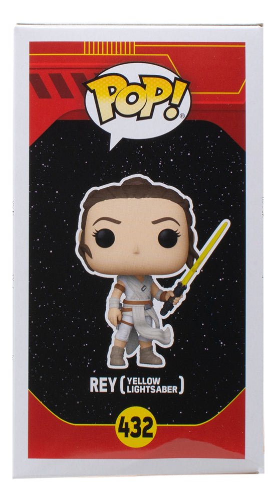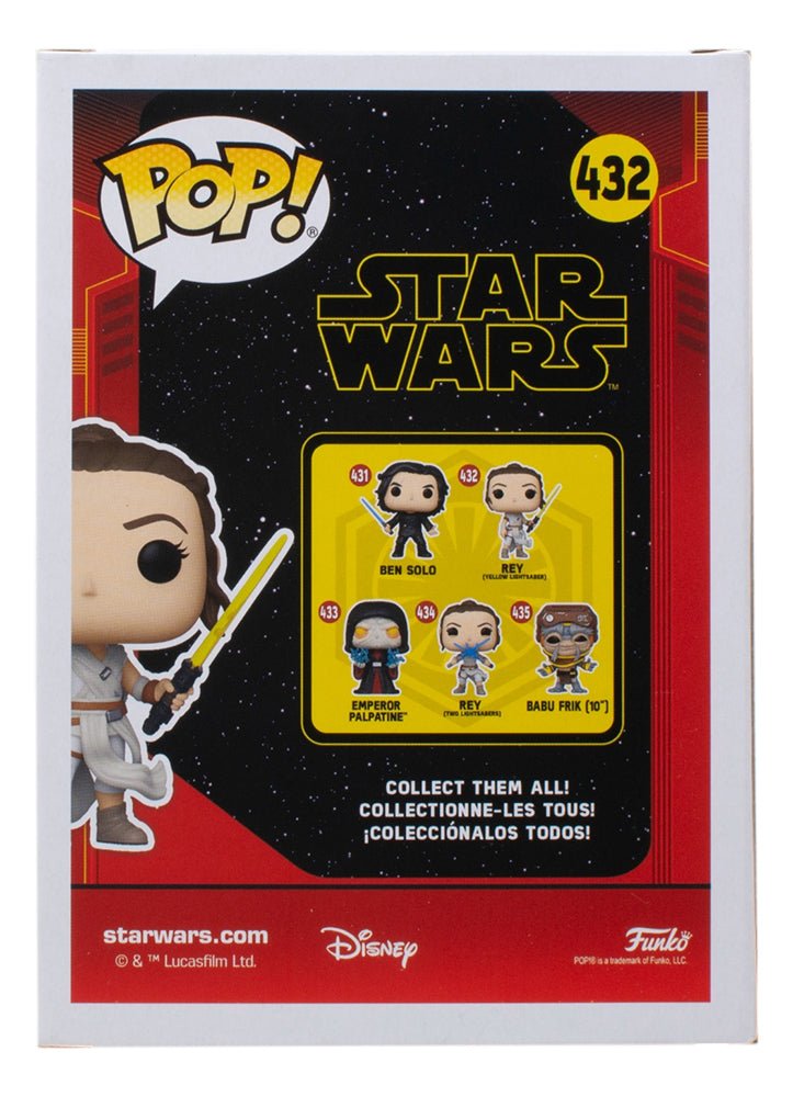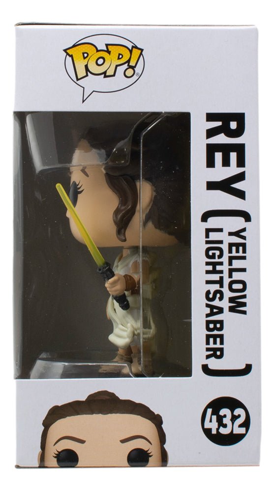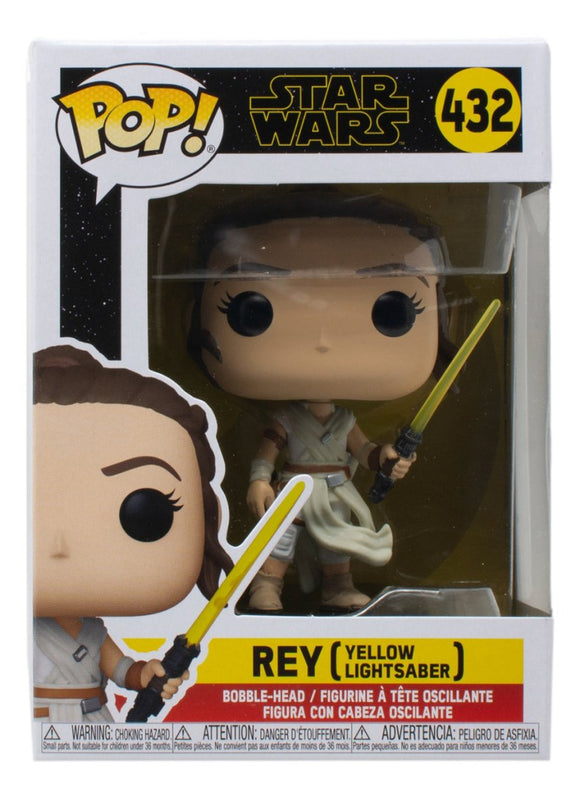 Star Wars Rey Yellow Lightsaber Funko Pop! vinyl figure #404 measures approximately 3 3/4-inches tall. Comes packaged in a window display box..