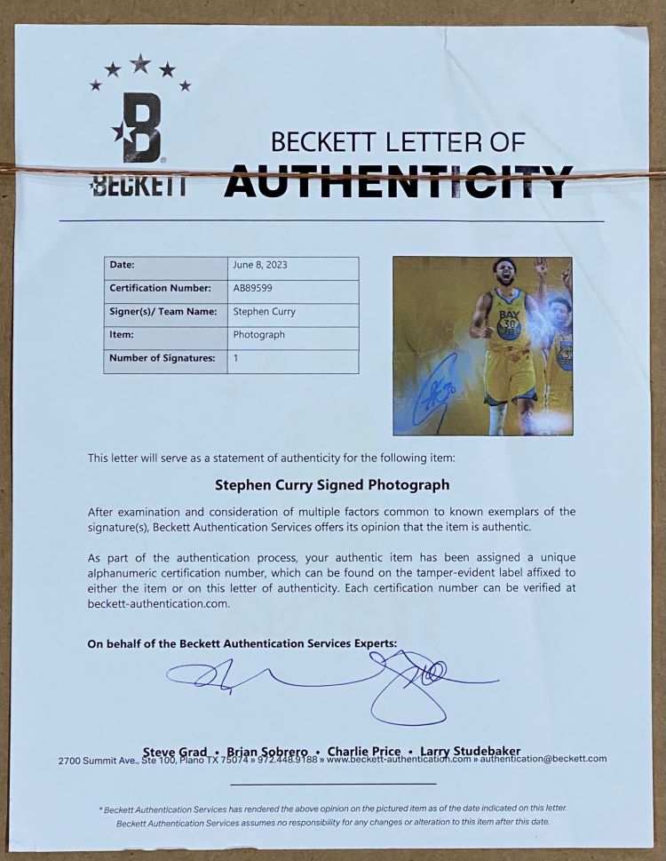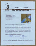 Featured is a Stephen Curry signed 16x20 Golden State Warriors photo. This photo has been hand signed by Curry and comes with the Beckett hologram and letter of authenticity. This photo has been professionally framed and matted and is approximately 22x27. This photo would make a great addition to any sports memorabilia collection!.