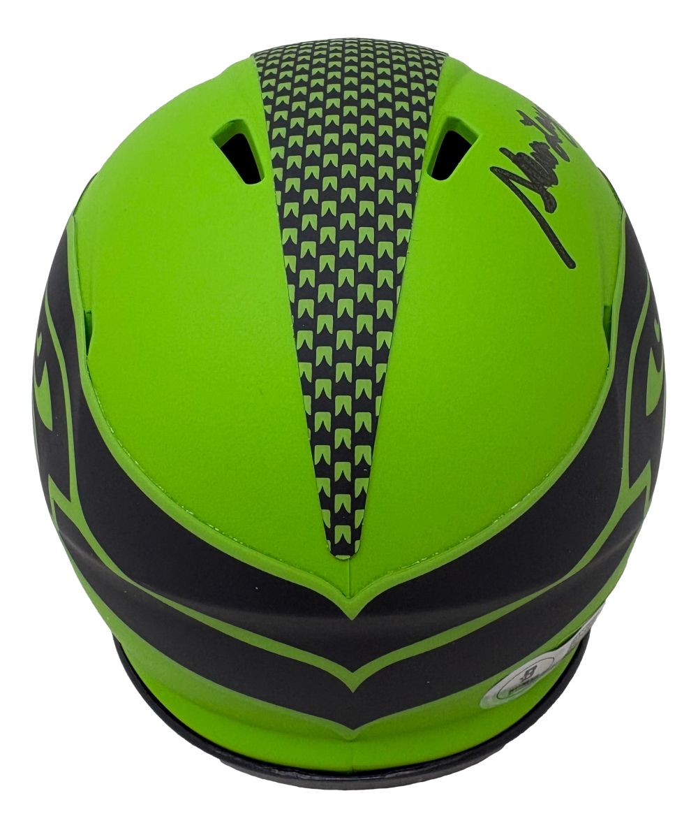 Featured is a Steve Largent signed Seattle Seahawks mini speed helmet, inscribed "HOF 95". This helmet has been hand signed by Largent and comes with the Beckett hologram and certificate of authenticity. This helmet would make a great addition to any sports memorabilia collection!