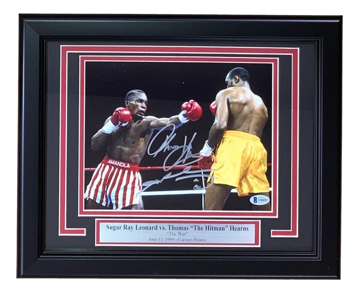 Featured is a Sugar Ray Leonard and Thomas Hearns signed 8x10 boxing photo. This photo was hand signed by Sugar Ray Leonard and Thomas Hearns and has been authenticated by Beckett authentication services. Included with the photo is a Beckett hologram and certificate of authenticity. This photo has been professionally framed and matted and is approximately 11x14. This item would make a great addition to any sports memorabilia collection!.