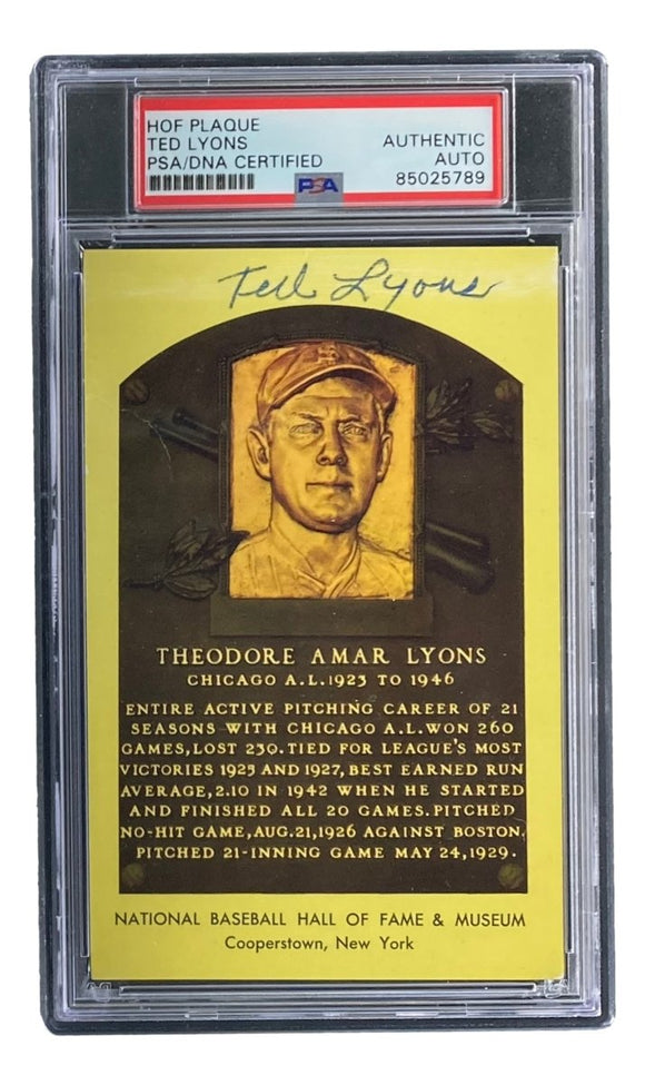 Featured is an Ted Lyons (Chicago White Sox) signed 4x6 Hall Of Fame plaque card. This card has been hand signed by Lyons and has been authenticated and encapsulated by PSA/DNA. This card would make a great addition to any sports memorabilia collection!.