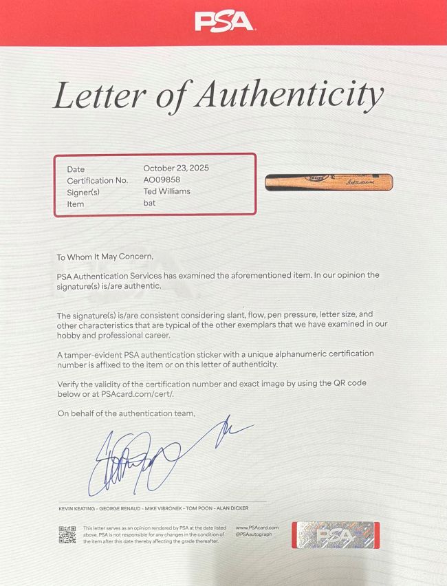 Featured is a Ted Williams signed Louisville Slugger baseball bat. This bat has been hand signed by Williams and comes with the PSA/DNA hologram and letter of authenticity. This bat would make a great addition to any sports memorabilia collection!.