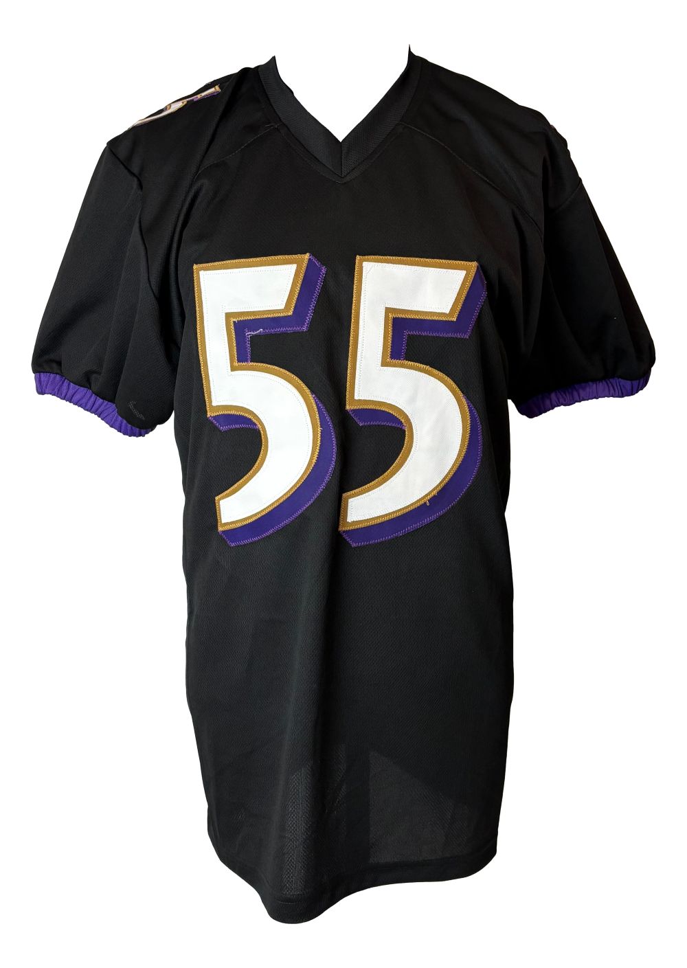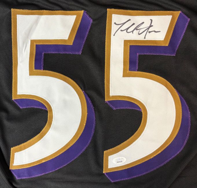 Featured is a Terrell Suggs signed custom football jersey. This jersey has been hand signed by Suggs and comes with the JSA hologram. This jersey features professionally sewn letters and numbers and is size XL. This jersey has no team tags or emblems and is intended as a sports collectible. This jersey would make a great addition to any sports memorabilia collection!.