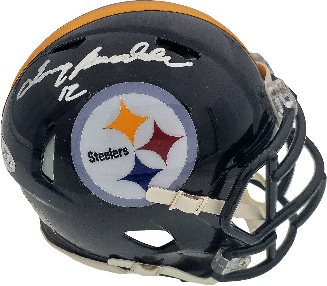 Featured is a Terry Bradshaw signed Pittsburgh Steelers mini speed helmet. This helmet has been hand signed by Bradshaw and comes with the Beckett hologram and certificate of authenticity. This helmet would make a great addition to any sports memorabilia collection!.