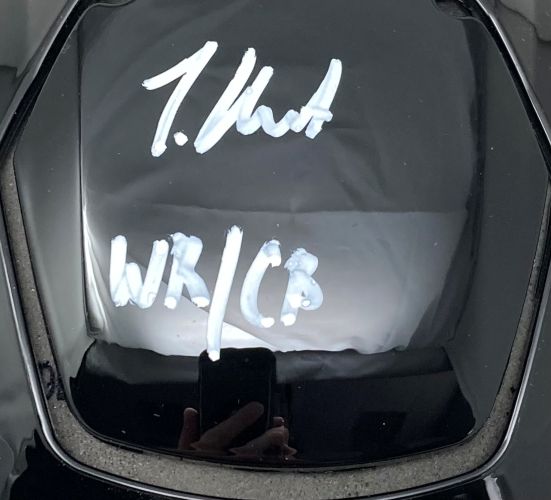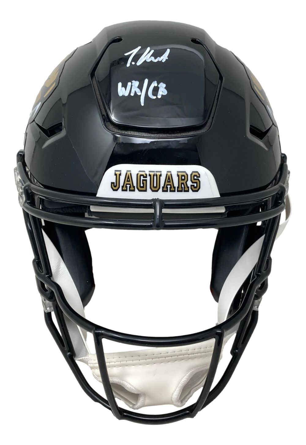Featured is a Travis Hunter signed Jacksonville Jaguars full size authentic SpeedFlex helmet, inscribed "WR/CB". This helmet has been hand signed by Hunter and comes with the Beckett hologram and certificate of authenticity. This helmet would make a great addition to any sports memorabilia collection!
