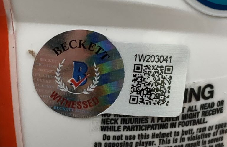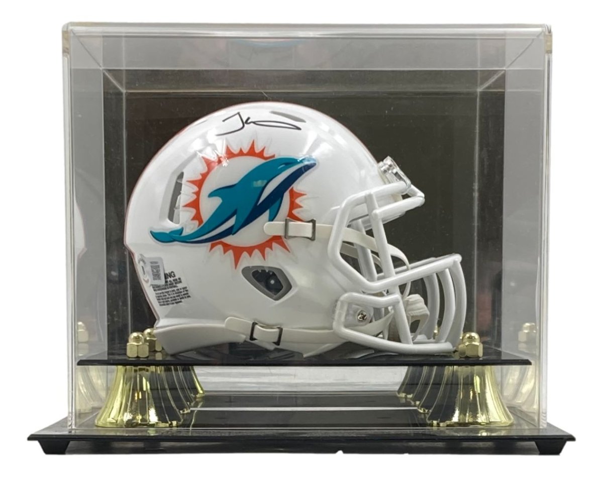 Featured is a Tyreek Hill signed Miami Dolphins mini speed replica helmet. This helmet was hand signed by Tyreek Hill in the presence of a Beckett authentication representative. Included with the helmet is a Beckett hologram and certificate of authentication. Included with this helmet is a deluxe acrylic display case. This helmet would make a great addition to any sports memorabilia collection..