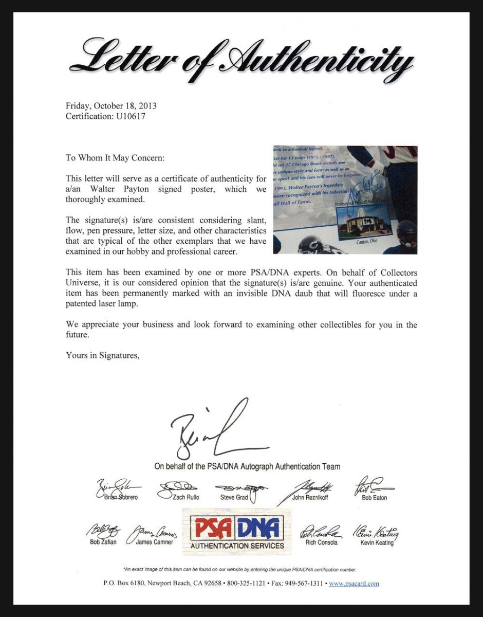 Featured is a Walter Payton signed 16x20 Chicago Bears photo. This photo has been hand signed by Payton and comes with the PSA hologram and letter of authenticity. This photo would make a great addition to any sports memorabilia collection!.