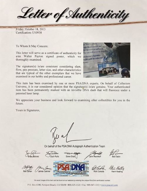 Featured is a Walter Payton signed 16x20 Chicago Bears photo. This photo has been hand signed by Payton and comes with the PSA hologram and letter of authenticity. This photo has been professionally framed and matted and is approximately 22x29. This photo would make a great addition to any sports memorabilia collection!.