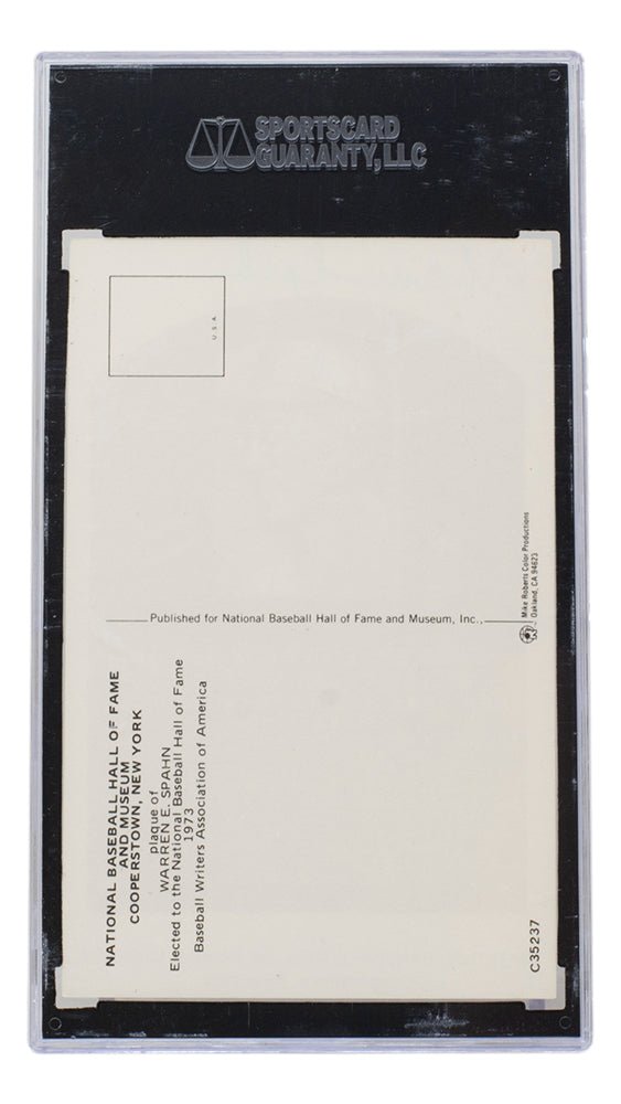 Featured is a Warren Spahn signed Milwaukee Braves hall of fame plaque post card. This post card was hand signed by Warren Spahn and slabbed and authenticated by SGC grading services. This item would make a great addition to any sports memorabilia collection..