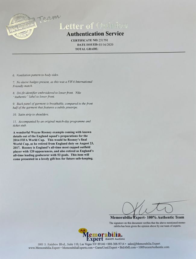 Featured is a Wayne Rooney game used 2014 England Nike soccer jersey. This jersey has been worn and used by Rooney and comes with the Memorabilia Experts Letter of Opinion. This jersey has been matched to 5/30/2014 when England defeated Peru 3-0 at Wembley Stadium. Jersey size is L. This jersey would make a great addition to any sports memorabilia collection!.