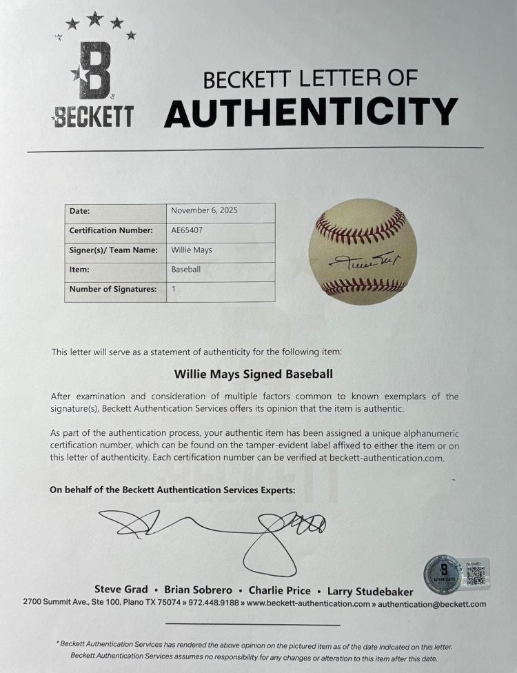 Featured is a Willie Mays signed official National League baseball. This ball has been hand signed by Mays and comes with the Beckett hologram and letter of authenticity. This ball would make a great addition to any sports memorabilia collection!.