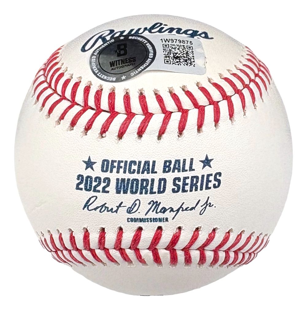 Featured is a Yordan Alvarez signed Rawlings official 2022 World Series baseball. This ball has been hand signed by Alvarez and comes with the Beckett hologram and certificate of authenticity. This ball would make a great addition to any sports memorabilia collection!.