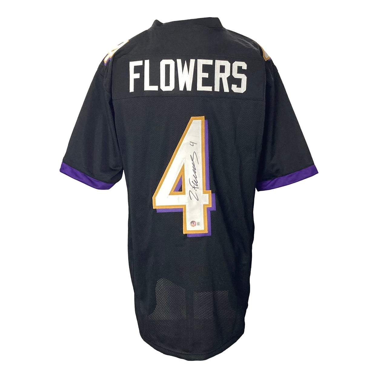 Featured is a Zay Flowers signed custom football jersey. This jersey has been hand signed by Flowers and comes with the Beckett witnessed hologram and certificate of authenticity. This jersey features professionally sewn letters and numbers and is size XL. This jersey has no team tags or emblems and is intended as a sports collectible. This jersey would make a great addition to any sports memorabilia collection!.